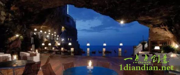 在意大利南部的Polignano镇,有一个颇为独特的洞穴餐厅Grotta Palazzese,该餐厅是Grotta Palazzese酒店的一部分,只在夏季开放。位于一个古老的石灰岩洞穴,向外伸向大海。提供龙虾,海鲜,贝类和传统的地中海菜肴,在这间餐厅中就餐时,放眼望去,蓝色的亚得里亚海就在眼前,能在此聆听海浪拍打岩石的自然节奏与并感受浪漫意大利气息。