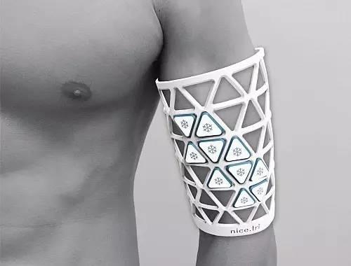 健身的朋友都会遇到肌肉酸痛的情况,怎么办呢?这款获得2017概念设计红点奖的作品名叫NiceTri,专门用于缓解手臂肌肉酸痛。网状设计有弹性,然后可以滑到特定的部位,里面是冰胶冷疗。整个设计既防水又耐用,可清洗、可反复使用。