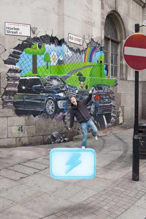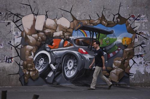 伦敦的The Viral Factory公司为了推广其一款赛车游戏,邀请了众多艺术家在各大街头画上巨幅3D画面,内容则是游戏中的场景。游戏通过3D街头艺术来进行宣传,这种创意勾住了观众的好奇心,也带来了极好的宣传效果。
