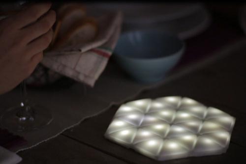 kawamura-ganjavian设计的柔性夜灯Kangaroo Light,由24个小三角形构成,每个里面内置1颗LED灯,能够发出柔和的白光,外部由柔性材料制成,可以随意折叠拉伸,放入包内随身携带。内置加速计,它会根据你的动作闪烁。通过USB充电,充满后可连续照明两个半小时。