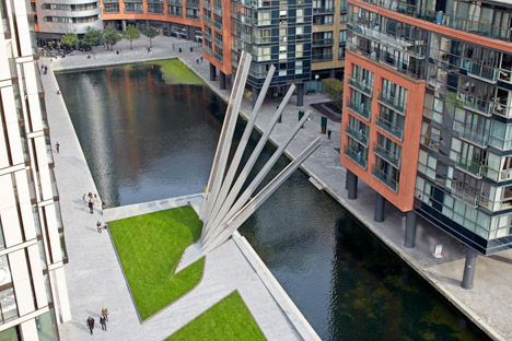 而今年在Paddington Basin的Grand Union Canal运河之上,由两大公司Knight Architects负责建造,以及AKT II负责机电工程,完成了一项可以自由开启(小编暂且暱称它为风扇叶片桥)的Merchant Square footbridge,由五个7吨重的的钢梁组合成主体,配合液压式千斤顶的操作方式,以及一个40吨重的起重机支撑,在距离达20公尺宽的河面上,最难之处是要维持高度安全性,每根钢柱必须保持不超过3mm的间隔,以保持桥梁开启时的准确精度。