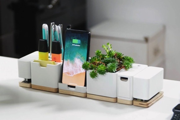 Re:ease 是一款桌面收纳产品,可以容纳 11 种不同的功能。在小磁铁的帮助下,每个组件可以单独使用或以任何配置连接在一起。包括打孔机、磨刀器、订书机、胶带切割机、智能手机充电底座、笔架等各种插槽,它们可以集中在同一个工作区上,创建一个干净的模块化单元,为用户提供所需的所有功能,而不会产生视觉混乱。【视频】