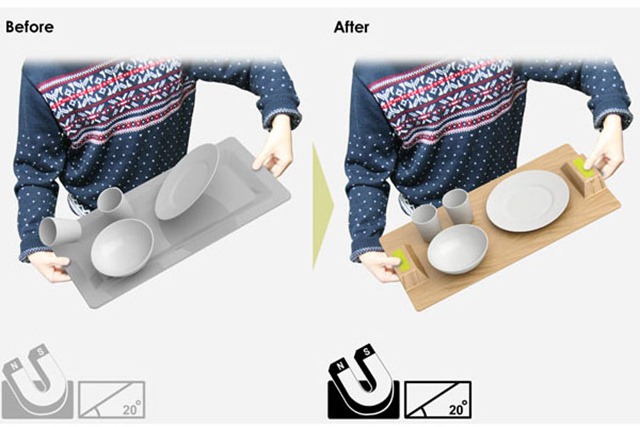 学生时代在学校食堂排队打饭的时候,最郁闷的是人群拥挤把餐具这些挤掉了,碗摔碎了不说,汤汤汁汁的溅了一身那才更加郁闷,提倡国内有实力的学校可以使用下面这套餐具餐盘,内置强力磁铁,需要的时候双手一按,盘子碗碟就会乖乖的被吸附住,不需要的时候一按又可以轻松解除,避免排队买饭中的一些不愉快的小插曲。
