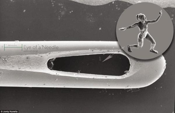 英国的一位艺术家 Jonty Hurwitz耗时10个月打造出一系列只有头发一半大小的超微型雕塑,他将其称为“纳米雕塑”。运用突破性的3d打印技术,在用于检查癌细胞的显微镜下花费10个月设计、雕刻,最终打造出这七个惊人的作品。他将打印好的纳米雕塑放在首饰盒的镜子上,在灯光的照射下如同七粒尘埃。Jonty Hurwit使用显微镜在镜子上花了45分钟时间才找到他的七个“尘埃”,但当Jonty Hurwit开心了一下子,一位同事试图移动镜子去欣赏这些雕塑,一不小心就用手指压碎了他的雕塑。