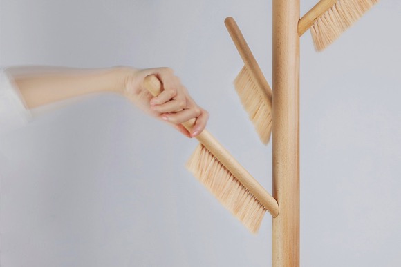 这是一款专门放置扫帚的衣架,它主要提醒你在挂衣服的时候就把衣服上的浮土浮尘一并扫除~
