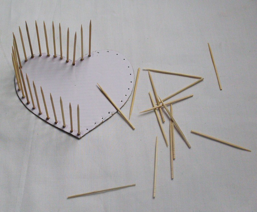 准备材料:牙签、毛线、珠子、硬纸板、胶水、锥子、剪刀、卡纸