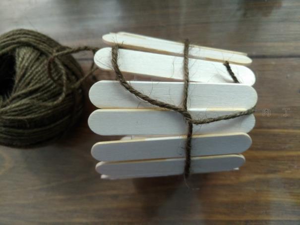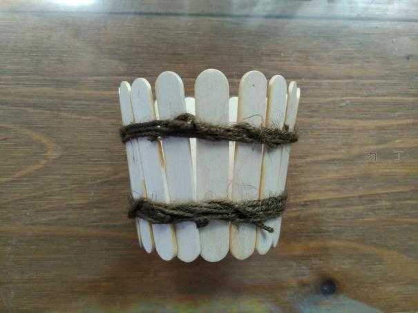 6、在杯体上侧再缠绕几圈麻绳(也可以根据自己喜好在木桶上画上图案),木桶就做好了。