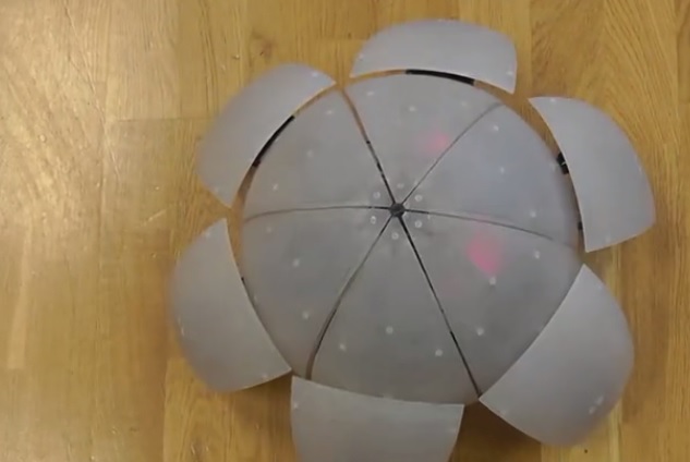 当它将六只花瓣一样的脚合起来就变成一个圆球,可以在地面上快速滚动;停下来时,就会伸展出六只脚来支撑地面,就像一只螃蟹,可以原地打转,更能碎步前行。