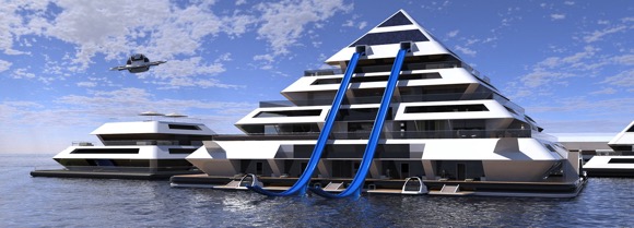 如果陆地资源不够,我们还有辽阔的海洋等待开发。设计师Pierpaolo Lazzarini为未来设想了一种长居海上的居住方式,他设计的“楼房”呈金字塔形状,有着宽广的底座,因此能在风浪中保持平衡与稳定,最大的房屋有3000㎡,高30米,可根据需要搭建不同功能,比如商场、运动场、居所等等;此外,还有灵活的小金字塔,一居室,方便预算不是很充足的人使用。