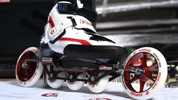 轮滑鞋的轮子越多,摩擦力就越大,起步就越快;但速度就会收到限制。德国一家公司推出了gripSPEEDER,号称世界上最快的轮滑鞋,做到了提速多轮、高速少轮的要求;鞋子上有两个超大号轮子和三个小号轮,其中小号轮在正常情况下与地面保持4mm的距离,因此高速滑行时只需要前后两个大轮;而当你需要提速或转弯时,人体向地面的压力会导致小轮接触地面,从而提供更多的接触和摩擦。