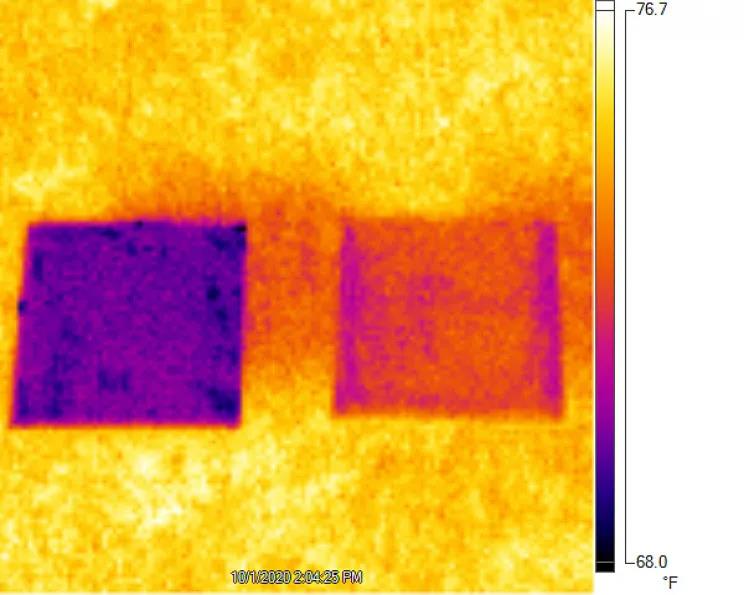 下方两个方块对比就很明显,左边是涂了超白涂料;右边是普通白色涂料,温度明显更低。