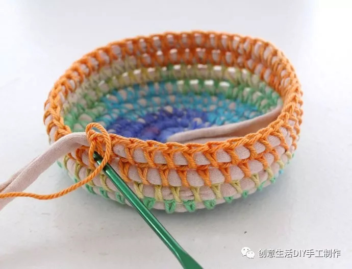 最后将布条全部钩织完后,再用毛线钩织一圈。