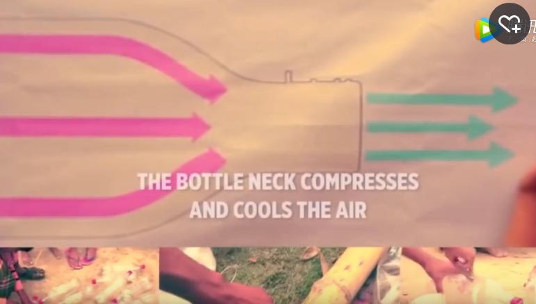 它不用电,室外的自然风进入了这个装置,到达瓶口较窄的位置时,空气就会被压缩,吹出来的风就比较凉快,达到降温效果。