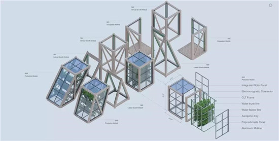 每一个模块里可以种植蔬菜和水果,不需要土壤,使用的是航空耕作系统,与传统种植相比,需要的地方只有其10%,并且,需要的水也很少。