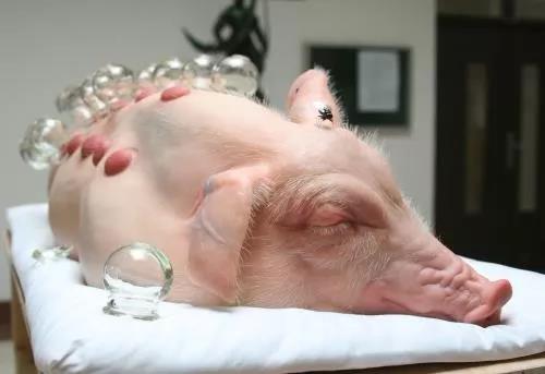 中国艺术家给猪拔罐,可惜不是真猪,身价高了,地位也不一样了。