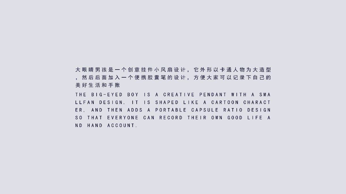 大眼怪小风扇围绕“陪伴、 治愈、 记录”的设计理念,采用仿生人格化的产品语意的设计,深蓝色磨砂质感材料,以卡通人物为大造型,饱满的身形线条圆润,增加了手持的舒适度和