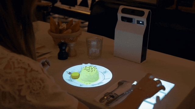 其实大致操作就跟索尼的 xperia touch 一样,投影是可以触摸的。点餐时只需动动小手点击右侧的菜单,对应的食物就会像魔法一样呈现在顾客面前了。不止是看起来炫酷,3D投影还能反映出食物的实际大小和外观,让你对即将下肚的东西更有数。