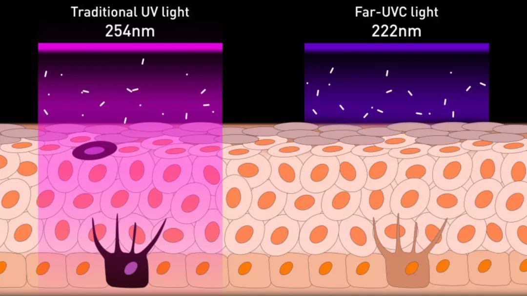在灯的下方有一个紫外线消毒灯,可以在几分钟内消灭空气中的病毒。根据研究表明,传统波长254nm的紫外线虽然可以杀灭病毒,但对身体有害;但222nm波长的远紫外线在杀灭病毒的同时不会对人体产生伤害。